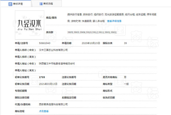 2021年03月13日漢中三國(guó)農(nóng)業(yè)科技有限公司搶注的第50661940號(hào)“九昱漢水”商標(biāo)初審公告,類別第39類,陜西中勉投資有限公司委托西安市商標(biāo)事務(wù)所對(duì)其提出異議申請(qǐng)。